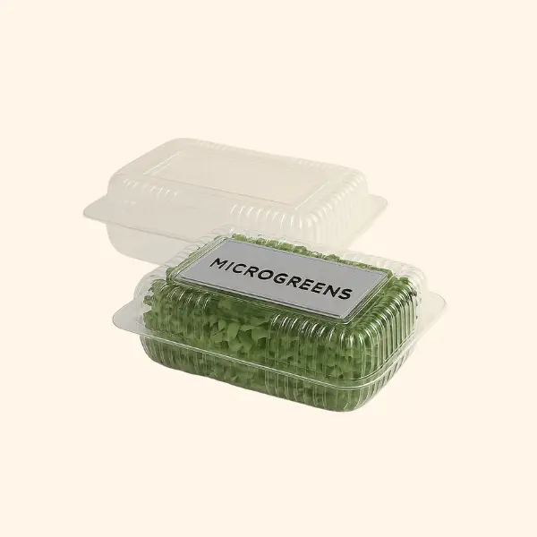 Transparent clamshell container with hinged lid and ribbed sides for secure food packaging. Ideal for microgreens, pastries, salads, and takeaway items. Made from durable food-grade plastic, lightweight and stackable.